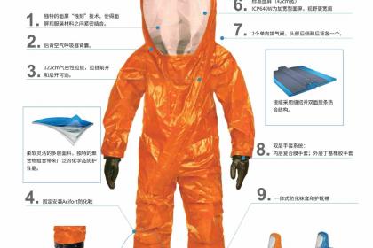 雷克兰拦截者系列ICP640WO宽屏气全封闭气密型防化服,呼吸器内置型设计,全部边缝采用内外双层热合胶带焊缝结构;正面门襟采用48英寸长气密型拉链,配合双层魔术搭扣门襟;超大加宽面屏采用特殊工艺在40mil厚的PVC软质面屏外涂敷10mil厚的特氟隆防化涂层;