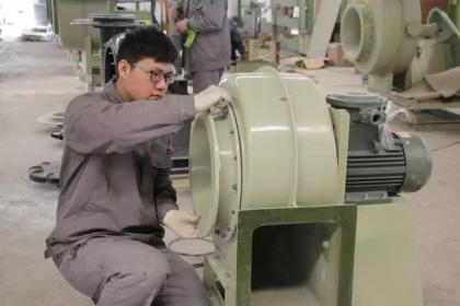 我们主要生产金属、塑料和高分子等不同材质制成的风机,其中,先进的产品是使用高分子玻璃钢材料。“FRP”系列风机以纯玻璃钢制造机壳、入口钟、叶轮等部件,改变了传统的碳钢衬玻璃钢制作工艺,解决了一般风机金属材质易腐蚀问题。同时,机壳与铁架连接螺栓采用整体成形包覆处理方式,解决了因腐蚀而造成螺栓损坏的问题,大幅提高了风机在使用过程中的稳定性和耐用性。